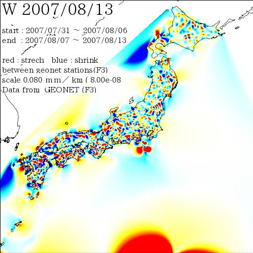 国土地理院geonetのデータを利用し、日本列島の伸び縮みを図にしました。