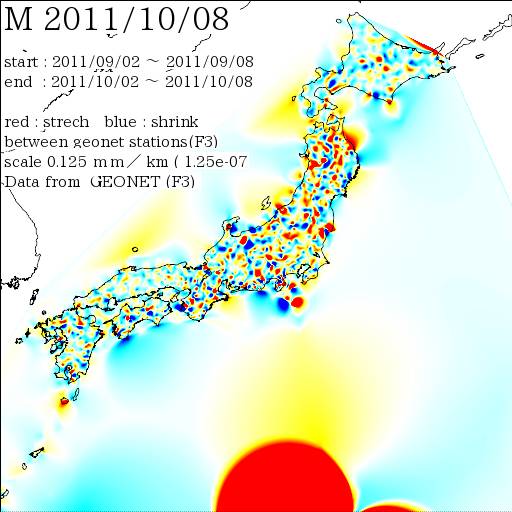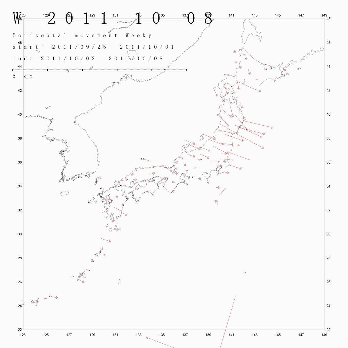 国土地理院geonetのデータを利用し、日本列島の伸び縮みを図にしました。