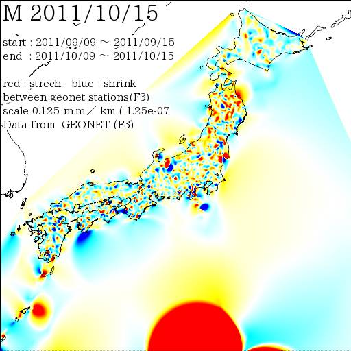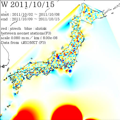 経験則では地上の断層系ばかりでなく、海洋プレートの活動が活発な場合にも、内陸の色が濃くなる場合が有るようです。(海の中はGPSでは観測できませんけれども。)