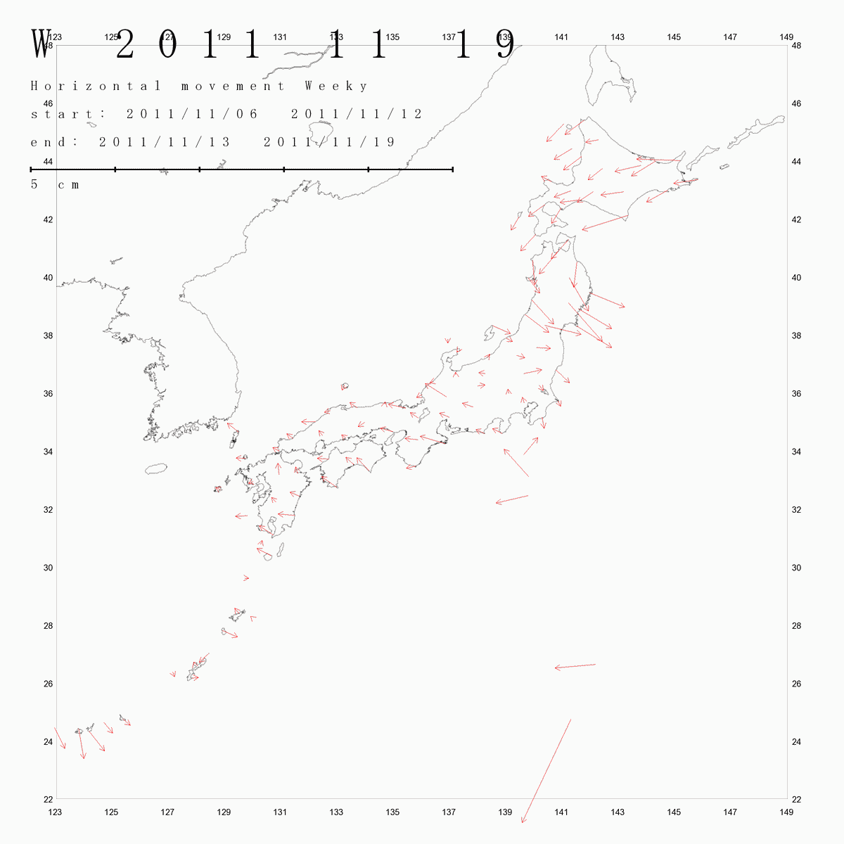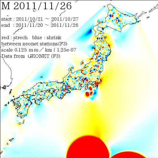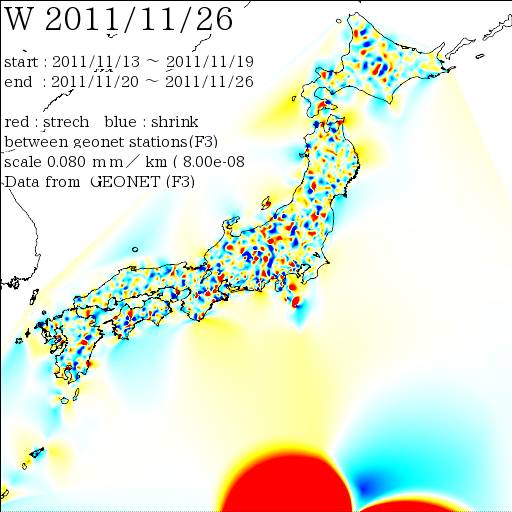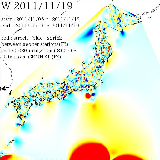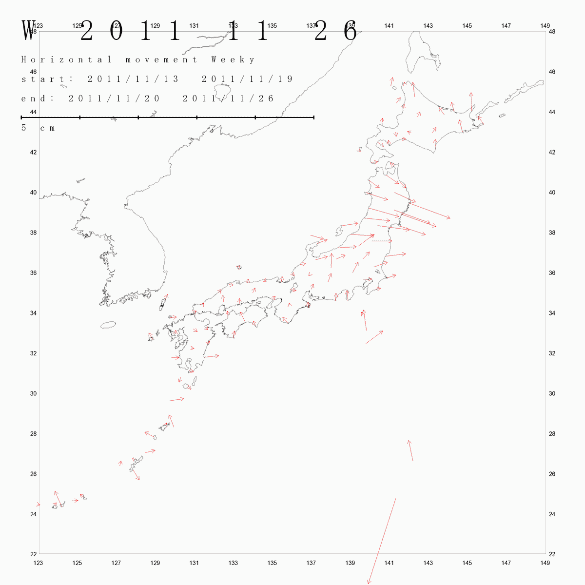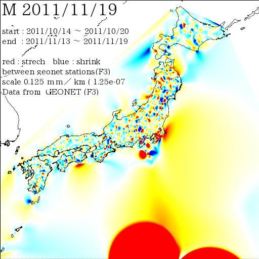 国土地理院geonetのデータを利用し、日本列島の伸び縮みを図にしました。