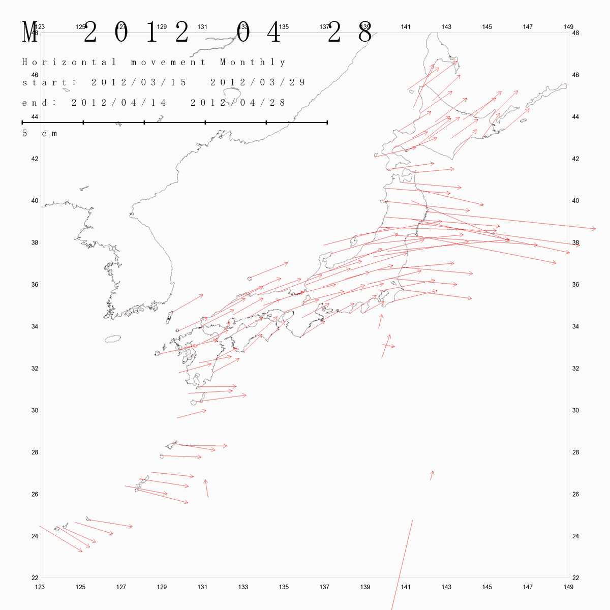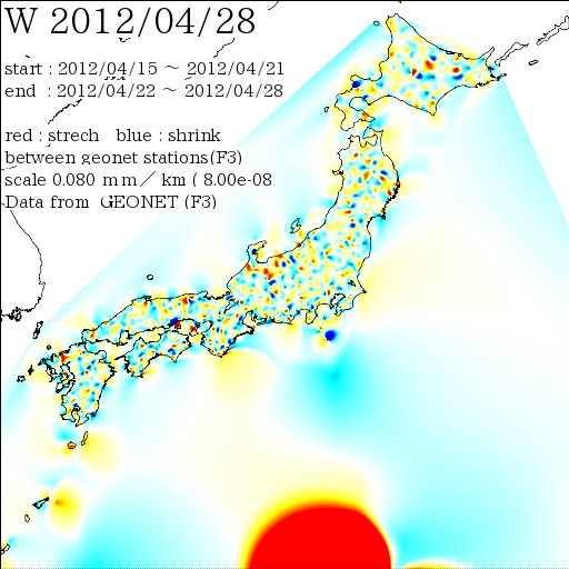 国土地理院geonetのデータを利用し、日本列島の伸び縮みを図にしました。