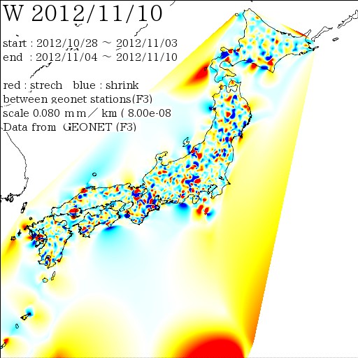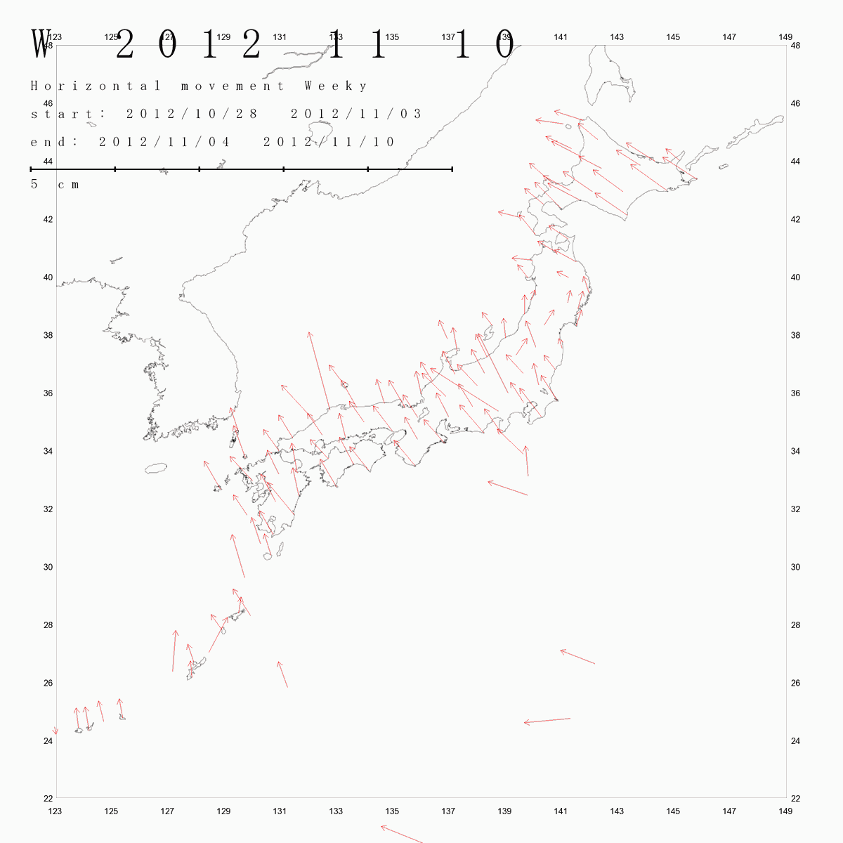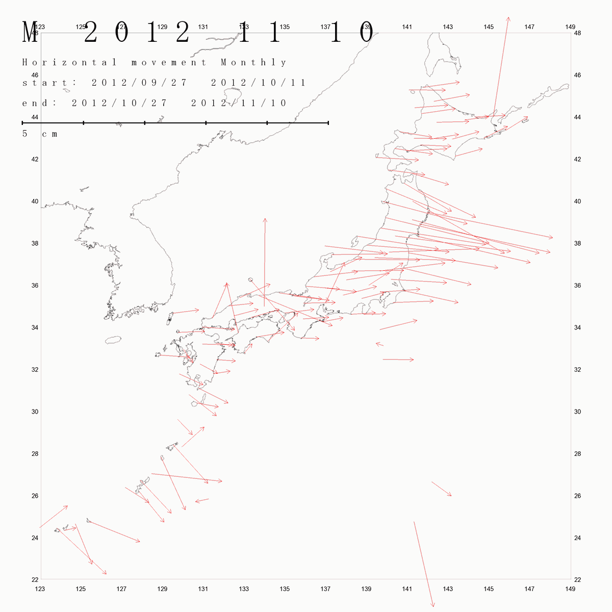 国土地理院geonetのデータを利用し、日本列島の伸び縮みを図にしました。
