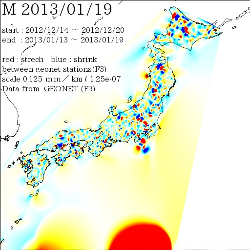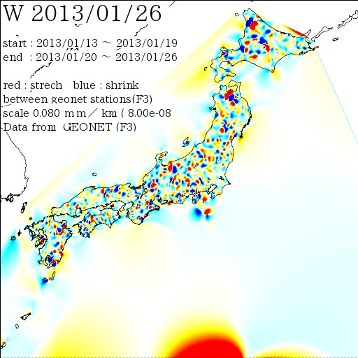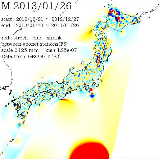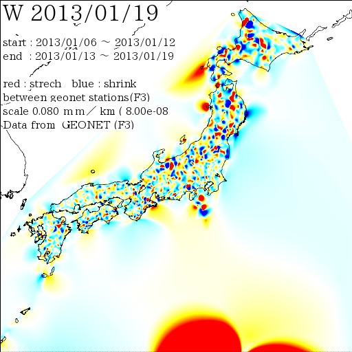国土地理院geonetのデータを利用し、日本列島の伸び縮みを図にしました。