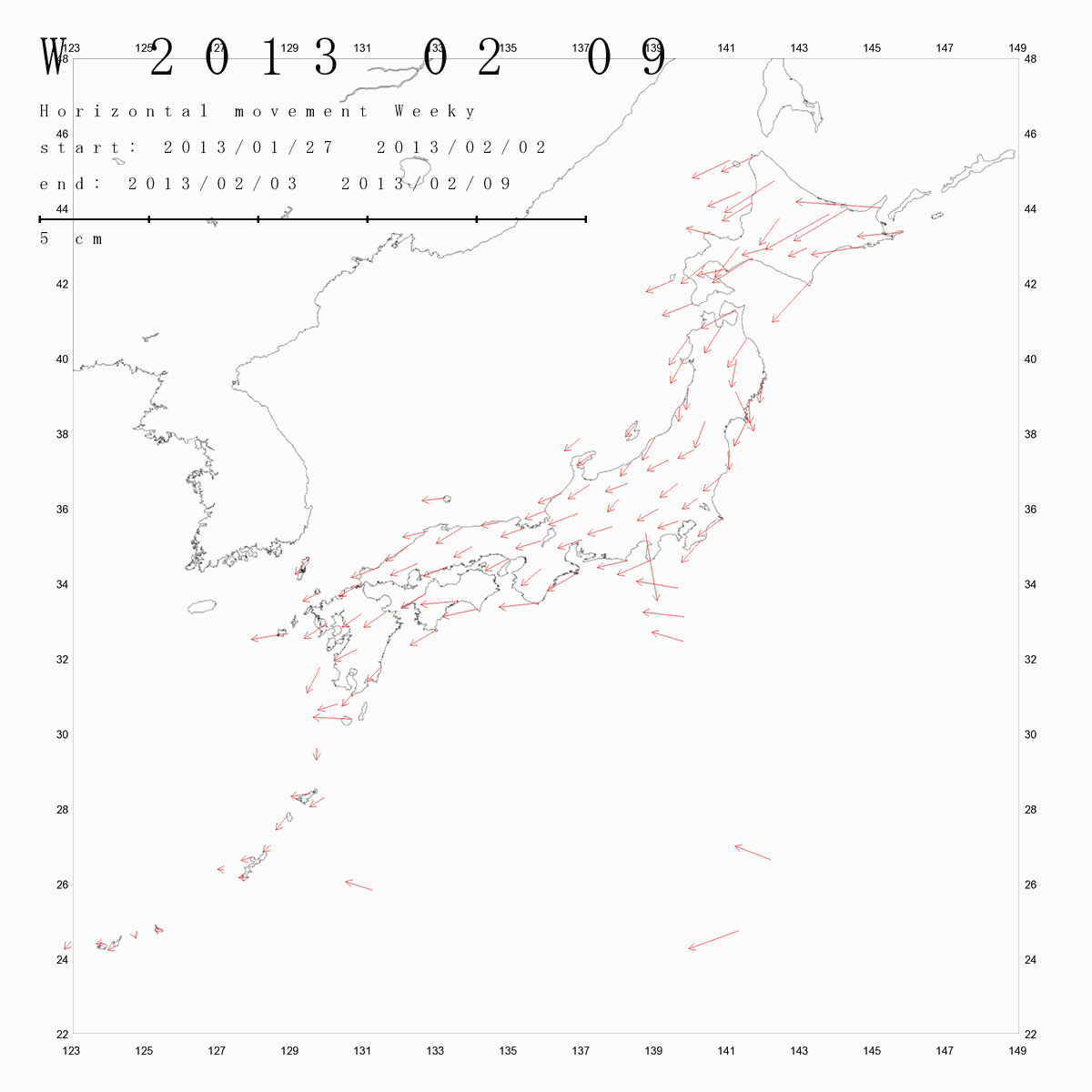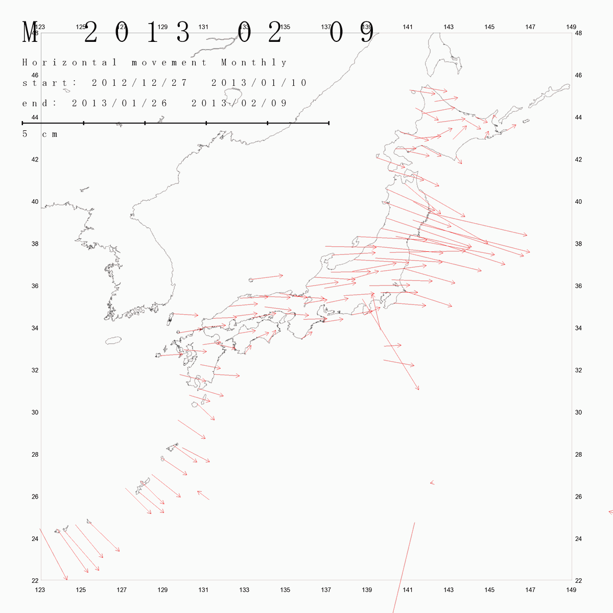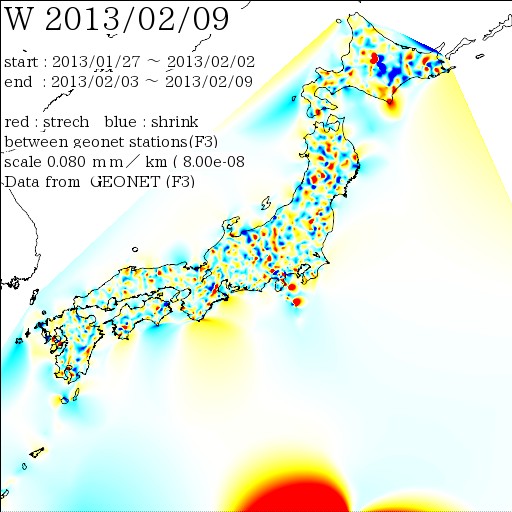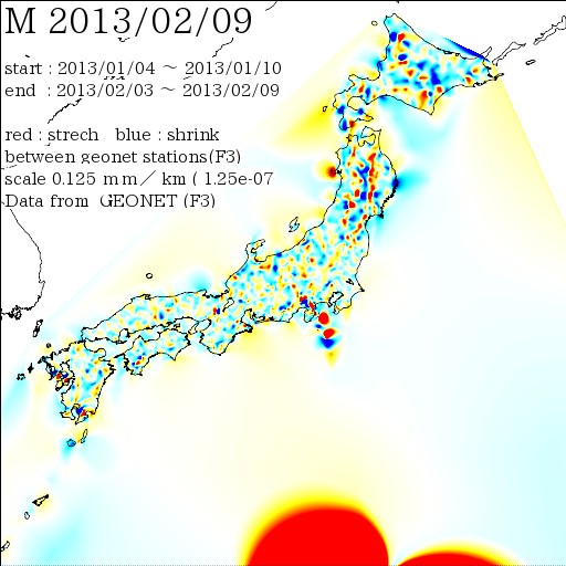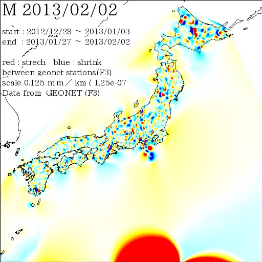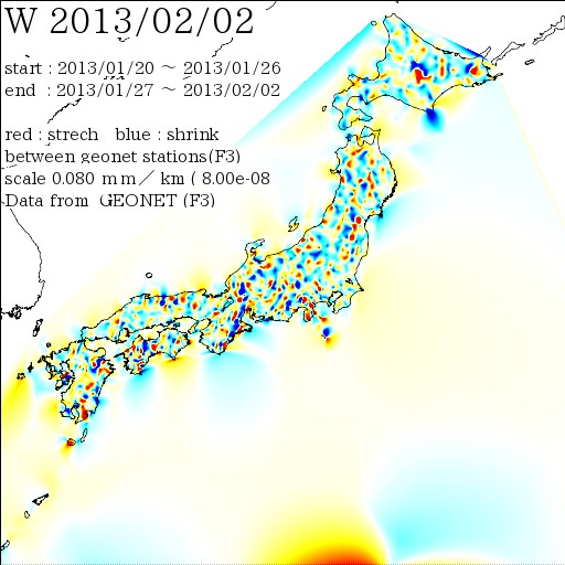 国土地理院geonetのデータを利用し、日本列島の伸び縮みを図にしました。