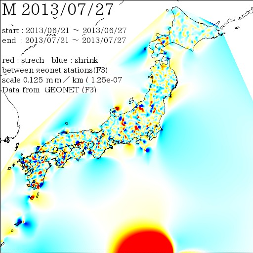 国土地理院geonetのデータを利用し、日本列島の伸び縮みを図にしました。