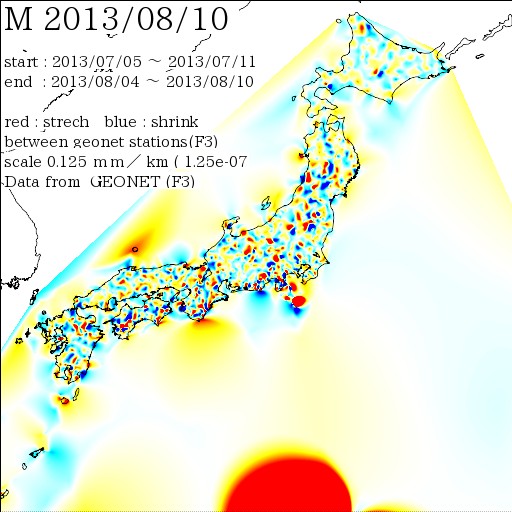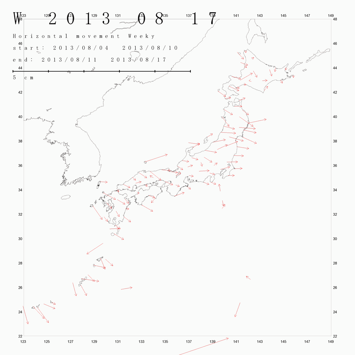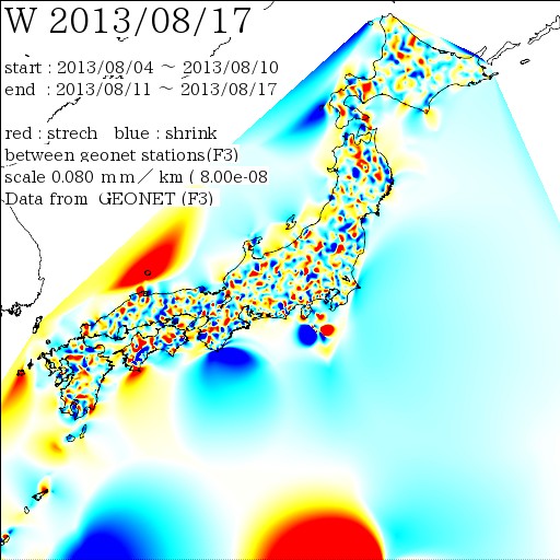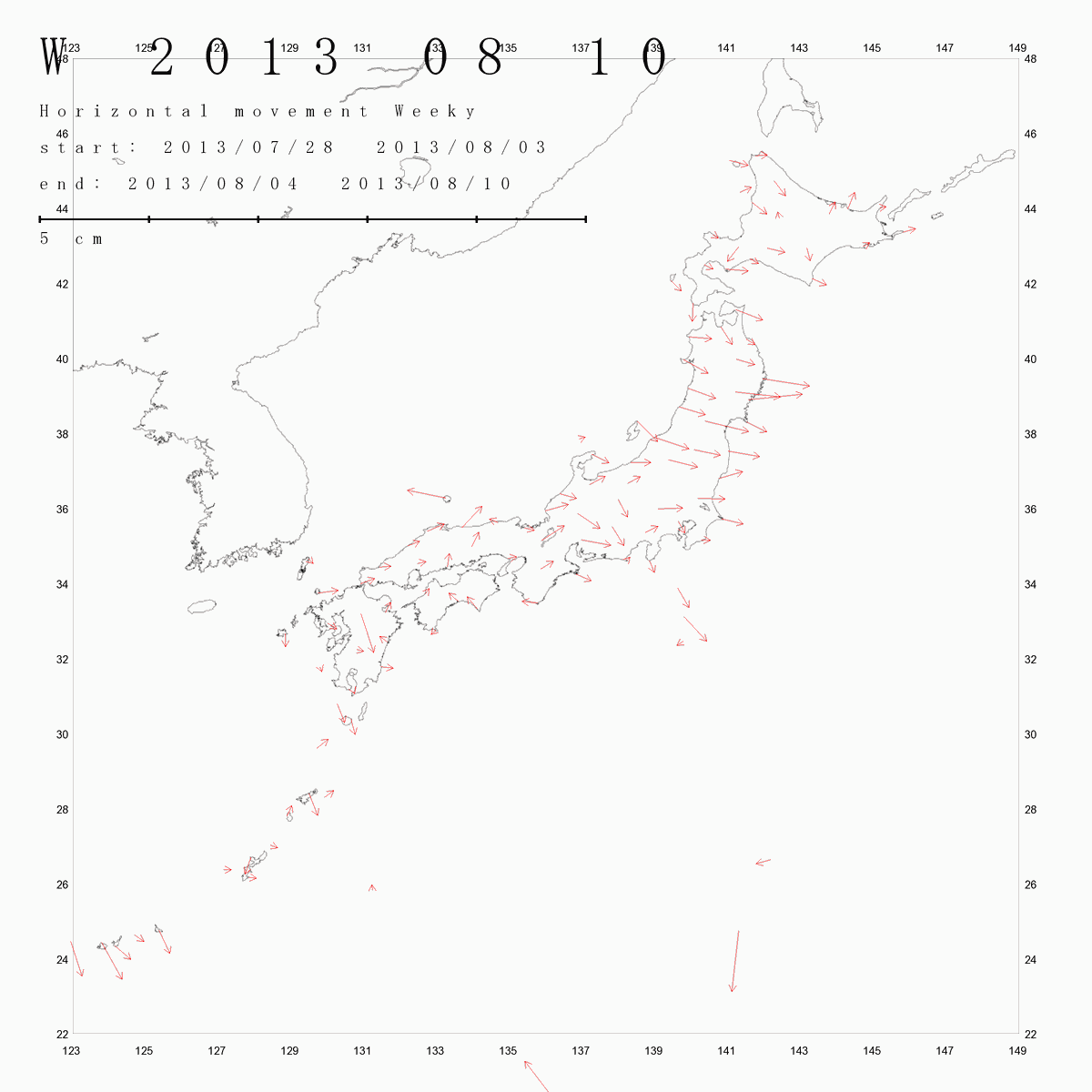 国土地理院geonetのデータを利用し、日本列島の伸び縮みを図にしました。