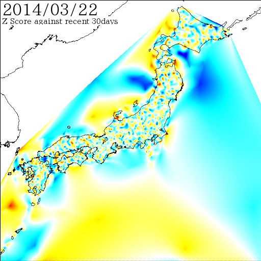各電子基準点間の距離を7日間移動平均でスムージング後、過去30日間の変動に対しての偏差値を計算しています。