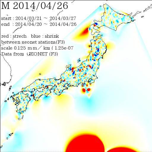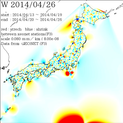 国土地理院geonetのデータを利用し、日本列島の伸び縮みを図にしました。