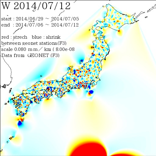国土地理院geonetのデータを利用し、日本列島の伸び縮みを図にしました。