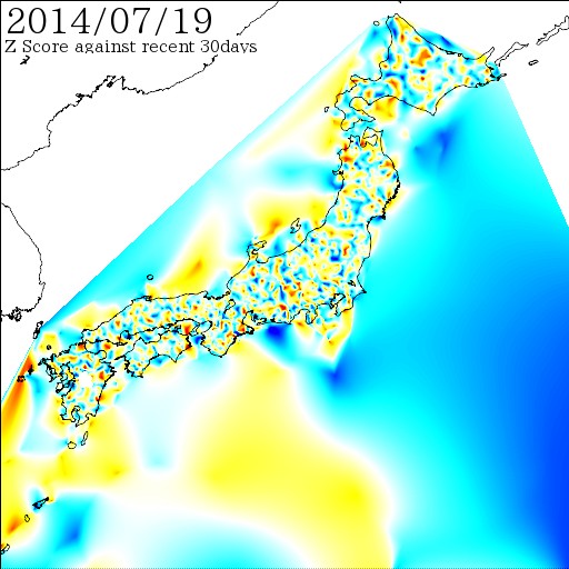 各電子基準点間の距離を7日間移動平均でスムージング後、過去30日間の変動に対しての偏差値を計算しています。