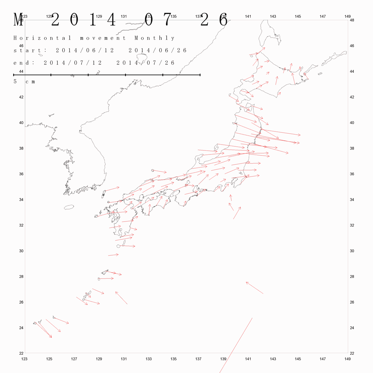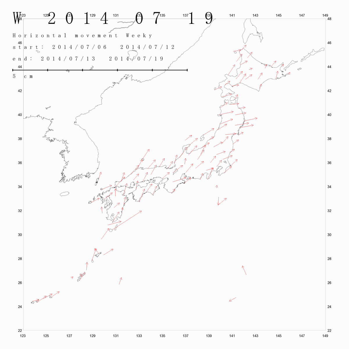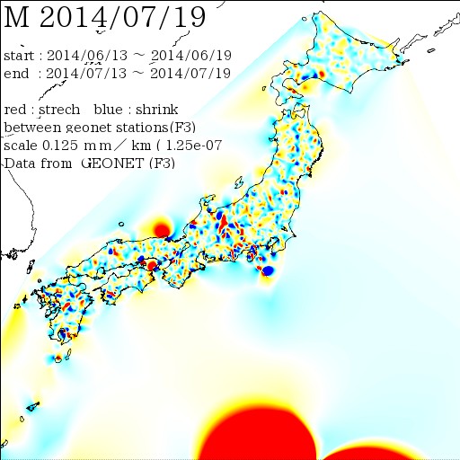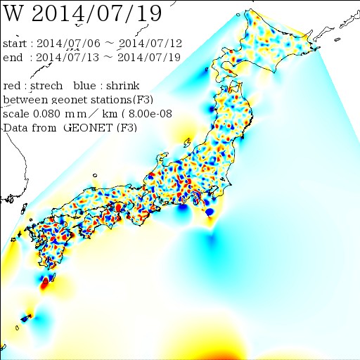 国土地理院geonetのデータを利用し、日本列島の伸び縮みを図にしました。
