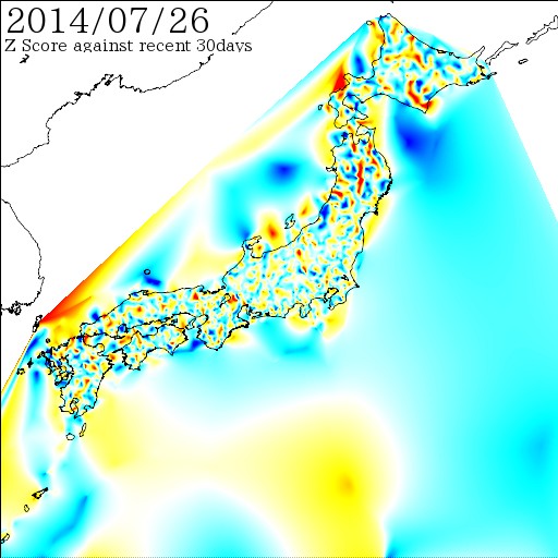 各電子基準点間の距離を7日間移動平均でスムージング後、過去30日間の変動に対しての偏差値を計算しています。