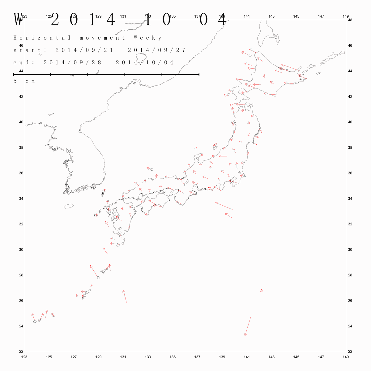 国土地理院geonetのデータを利用し、日本列島の伸び縮みを図にしました。