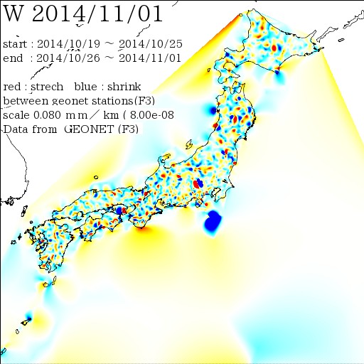 国土地理院geonetのデータを利用し、日本列島の伸び縮みを図にしました。