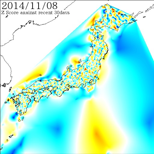 各電子基準点間の距離を7日間移動平均でスムージング後、過去30日間の変動に対しての偏差値を計算しています。