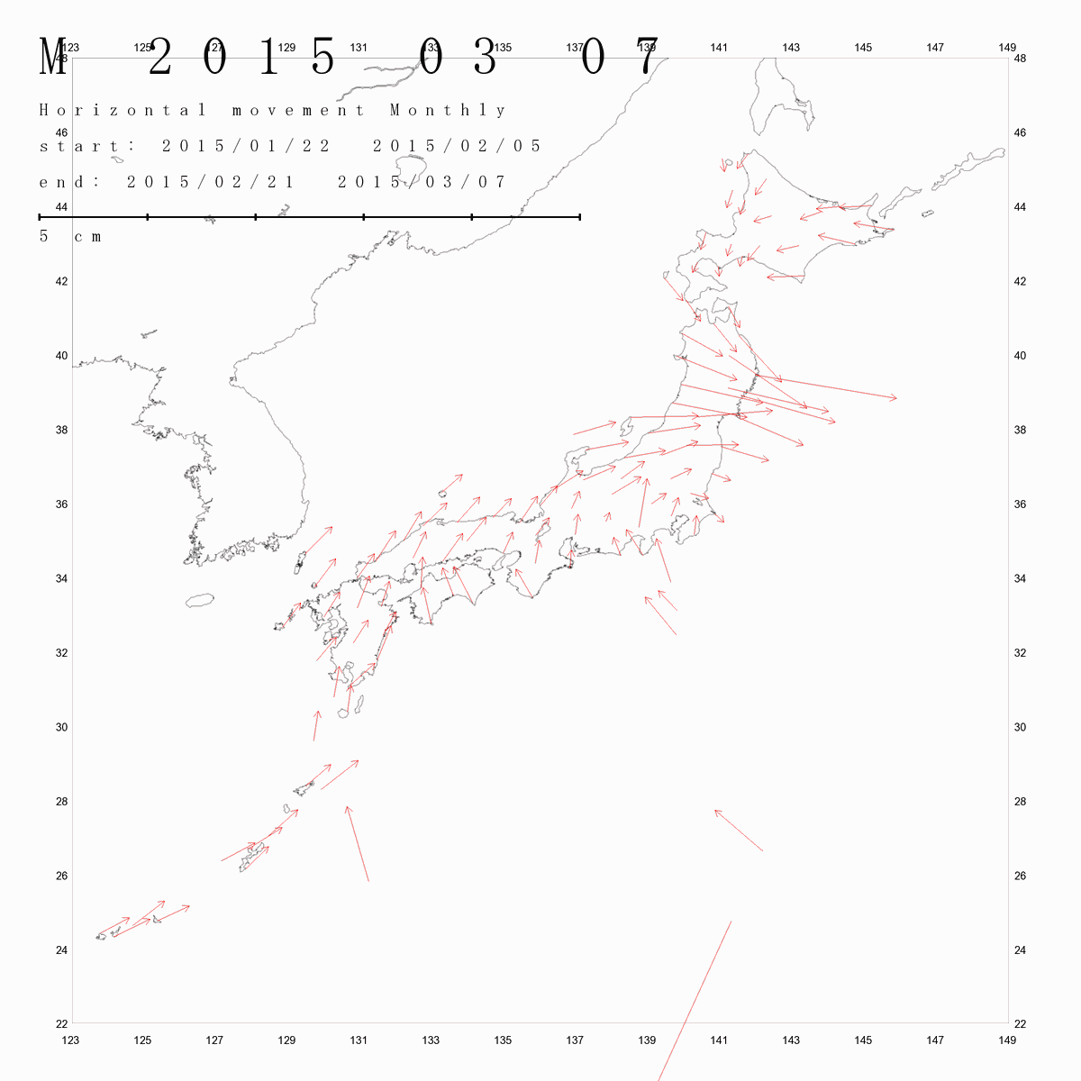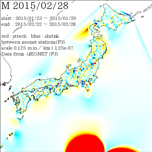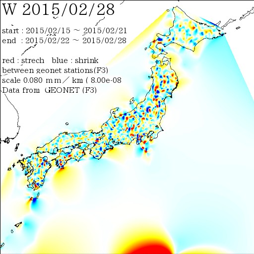 国土地理院geonetのデータを利用し、日本列島の伸び縮みを図にしました。