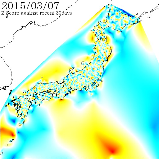 各電子基準点間の距離を7日間移動平均でスムージング後、過去30日間の変動に対しての偏差値を計算しています。