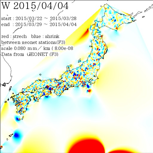 国土地理院geonetのデータを利用し、日本列島の伸び縮みを図にしました。