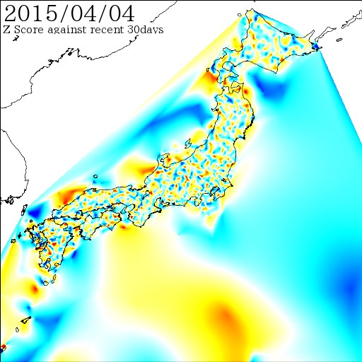 各電子基準点間の距離を7日間移動平均でスムージング後、過去30日間の変動に対しての偏差値を計算しています。