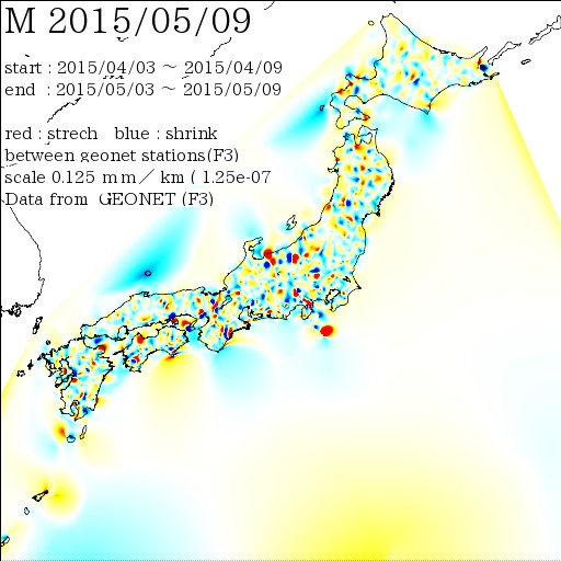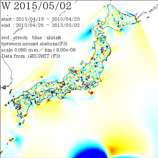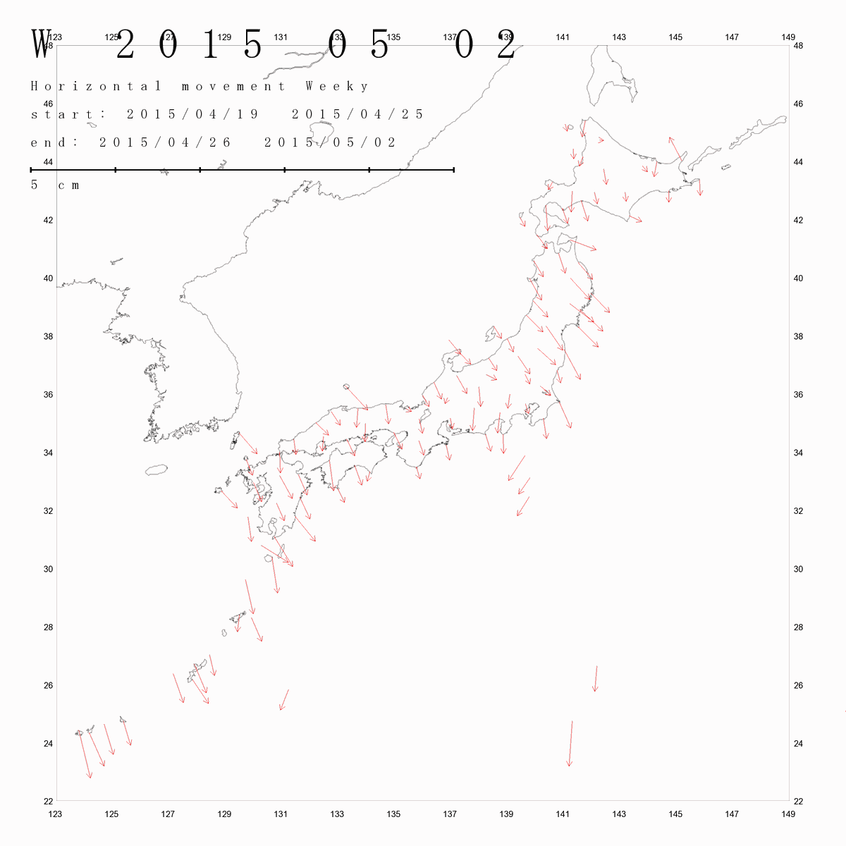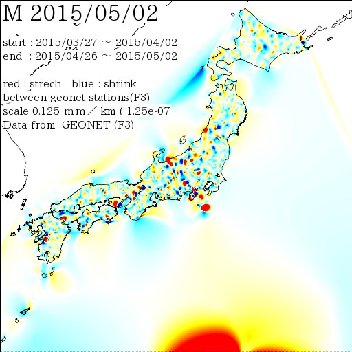 国土地理院geonetのデータ (日々の値 F3 )を利用し、日本列島の伸び縮みを図にしました。