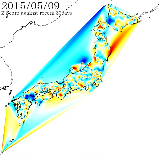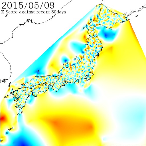 各電子基準点間の距離を7日間移動平均でスムージング後、過去30日間の変動に対しての偏差値を計算しています。