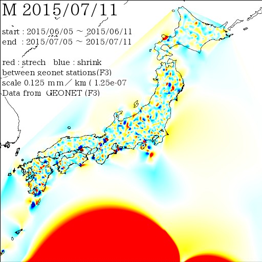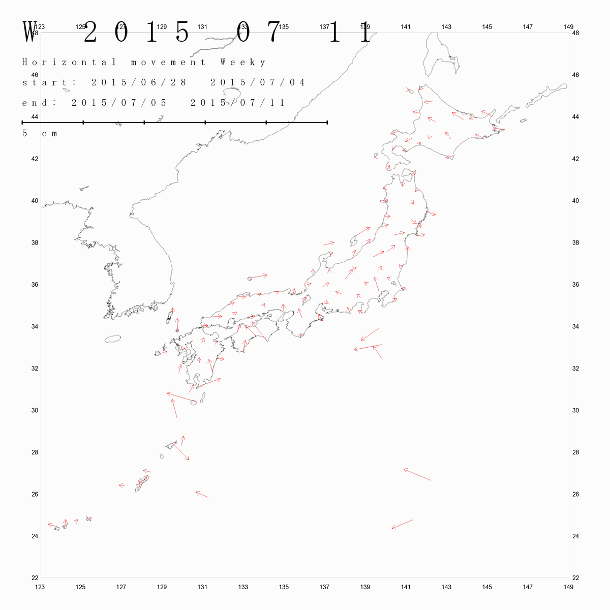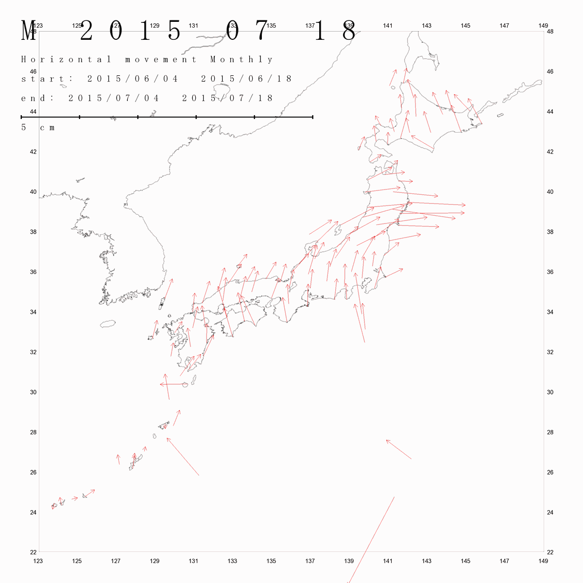 国土地理院geonetのデータ( 日々の値 F3 )を利用し、日本列島の伸び縮みを図にしました。