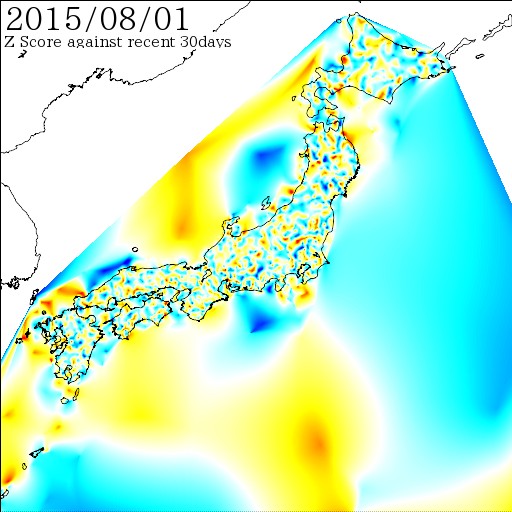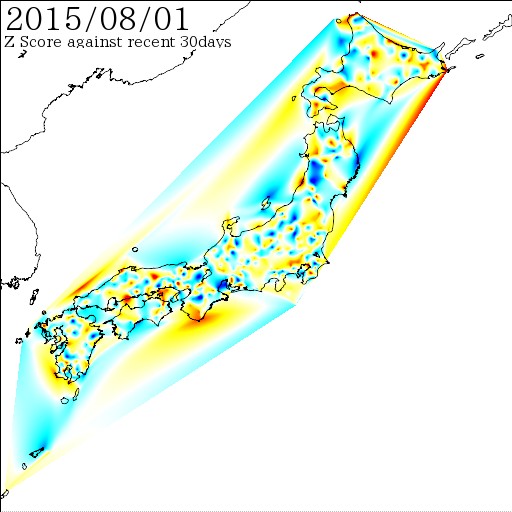 各電子基準点間の距離を7日間移動平均でスムージング後、過去30日間の変動に対しての偏差値を計算しています。