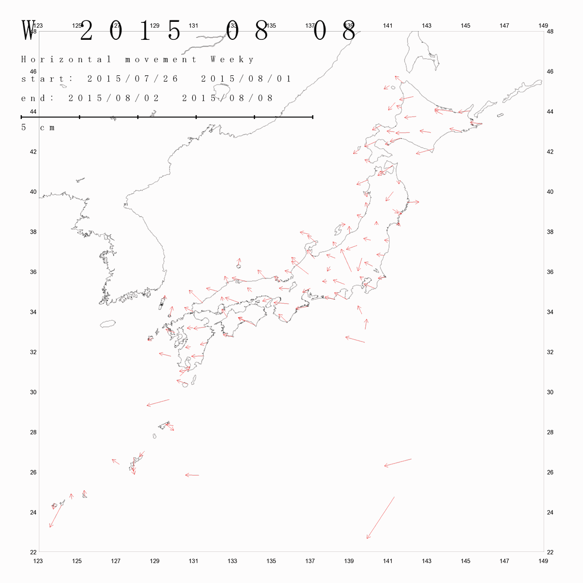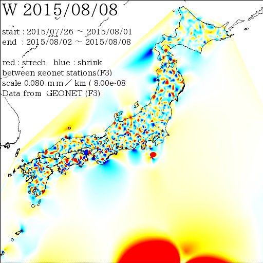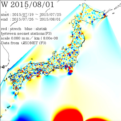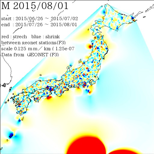 国土地理院geonetのデータ( 日々の値 F3 )を利用し、日本列島の伸び縮みを図にしました。
