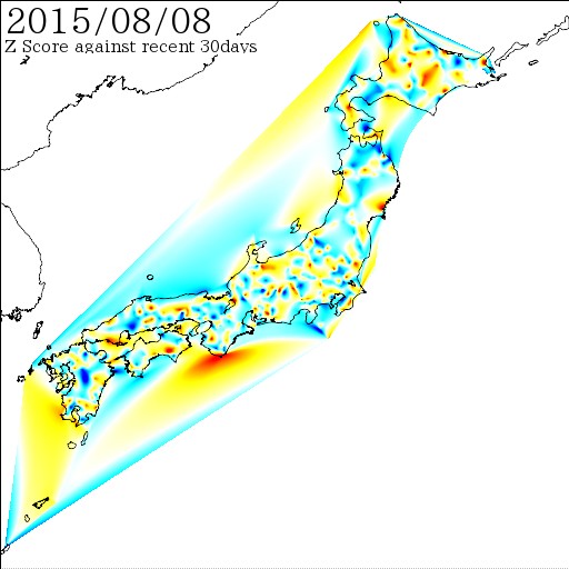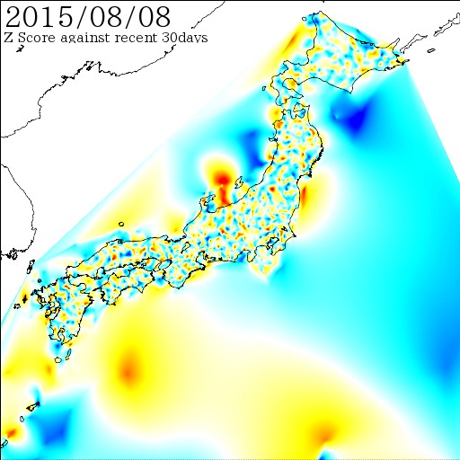 各電子基準点間の距離を7日間移動平均でスムージング後、過去30日間の変動に対しての偏差値を計算しています。