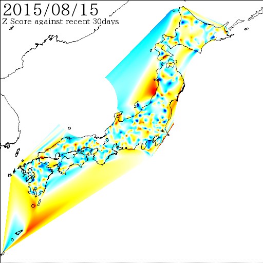 各電子基準点間の距離を7日間移動平均でスムージング後、過去30日間の変動に対しての偏差値を計算しています。