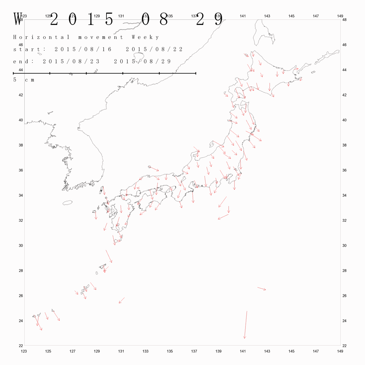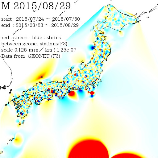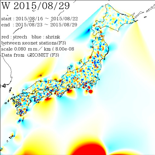 国土地理院geonetのデータ( 日々の値 F3 )を利用し、日本列島の伸び縮みを図にしました。