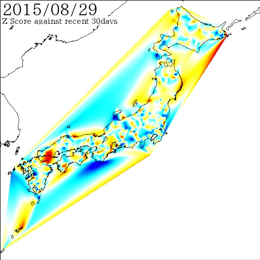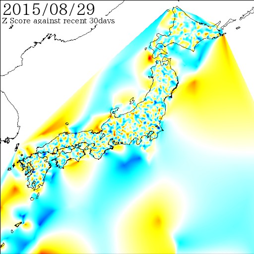 各電子基準点間の距離を7日間移動平均でスムージング後、過去30日間の変動に対しての偏差値を計算しています。