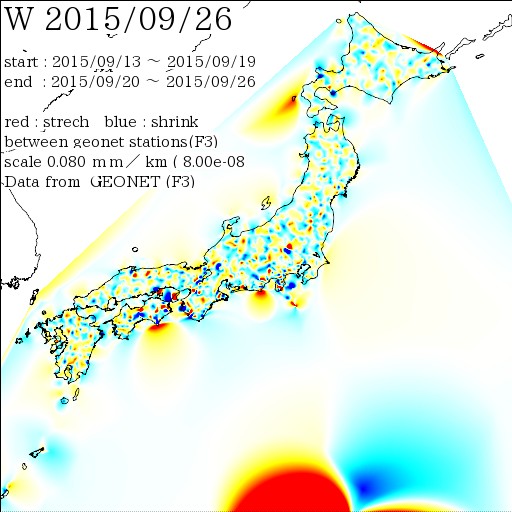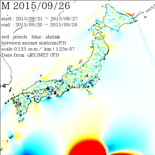 国土地理院geonetのデータ( 日々の値 F3 )を利用し、日本列島の伸び縮みを図にしました。