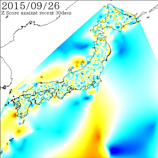 各電子基準点間の距離を7日間移動平均でスムージング後、過去30日間の変動に対しての偏差値を計算しています。