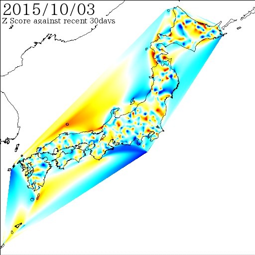 各電子基準点間の距離を7日間移動平均でスムージング後、過去30日間の変動に対しての偏差値を計算しています。