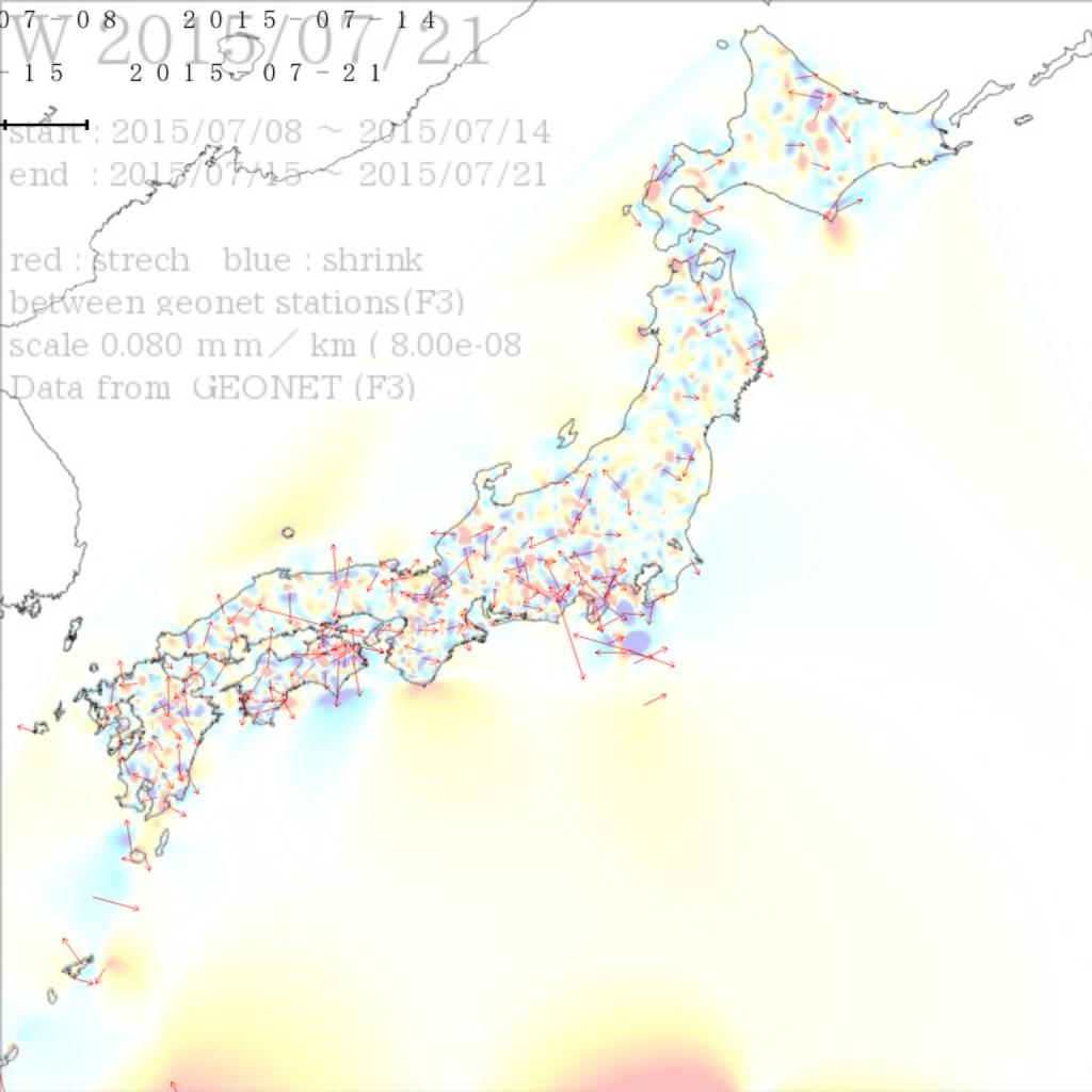7月4日現在のF3と比較すると、 水平伸縮が 東日本のほうで大きかったのが西日本でも大きく動いています (台風なども多かったので、F3精密解になるとかなり違ってくるかもしれませんけれども)